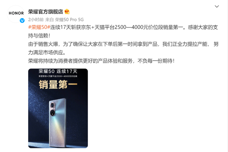 7月12日,荣耀官方宣布,荣耀50连续17天斩获京东+天猫平台2500到4000元价位段销量第一,同时正全力提拉产能,努力满足市场供应。