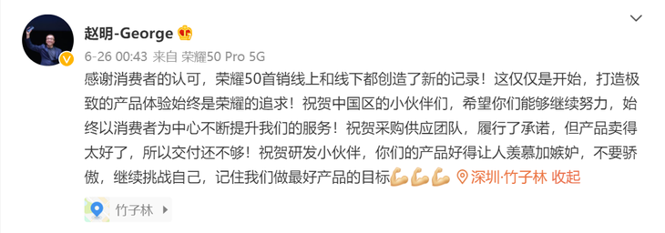 荣耀终端有限公司CEO@赵明在微博表示,荣耀50首销线上线下都创造了新纪录,这仅仅是开始,打造极致的产品体验始终是荣耀的追求。