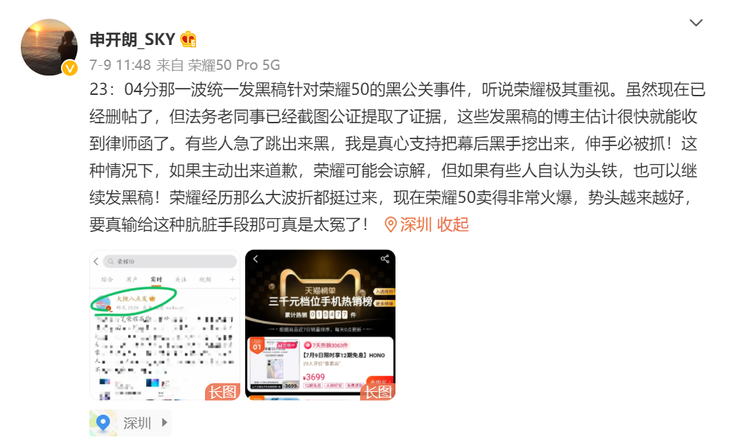 此前曾有一波疑似关于荣耀50的黑公关事件,据@申开朗_SKY在微博上透露的信息,荣耀极其重视23:04分那一波统一发黑稿针对荣耀50的黑公关事件,已经截图公证提取了证据,发黑稿的博主估计很快就能收到律师函,现在荣耀50卖得非常火爆,势头越来越好。
