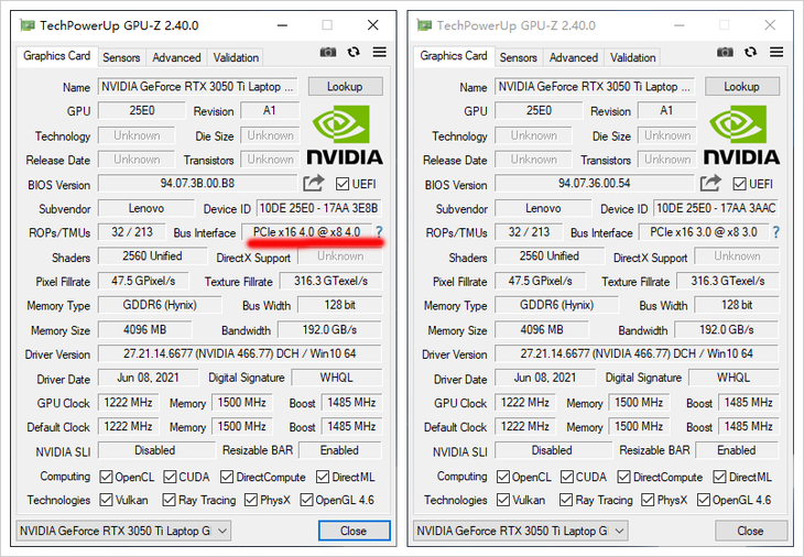 特别是,通过GPU-Z来看,这两款游戏本所搭配的RTX3050Ti笔记本电脑GPU的频率也是一模一样的。只不过,联想拯救者Y7000P 2021款的显卡是在PCIe4.0 x8模式下运行,联想拯救者R7000P 2021款的显卡是在PCIe3.0 x8模式下运行。显卡的这个差异主要是由英特尔和AMD平台的差异性决定的。英特尔H45移动处理器内建有20条PCIe4.0通道,能够充分发挥新一代RTX30系列显卡的性能。反观AMD这一代ZEN3架构移动处理器就要差一些了,新一代RTX30显卡仅能在其平台上运行在PCIe3.0 x8的模式下。