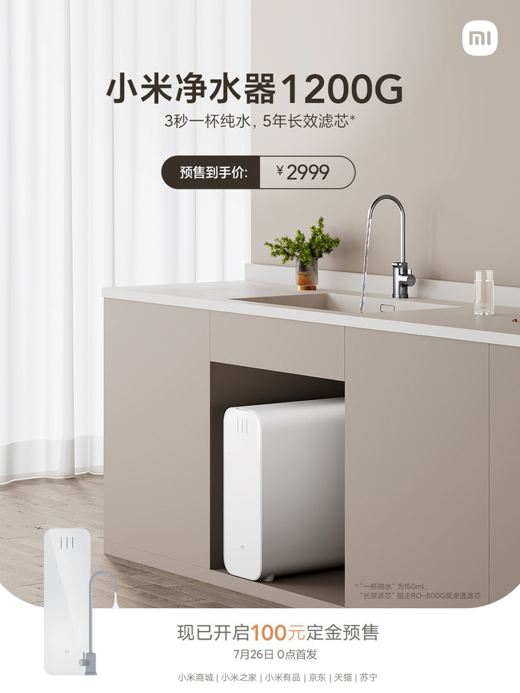 7月20日,小米智能生活宣布,小米净水器1200G开启定金预售,预售到手价2999元。