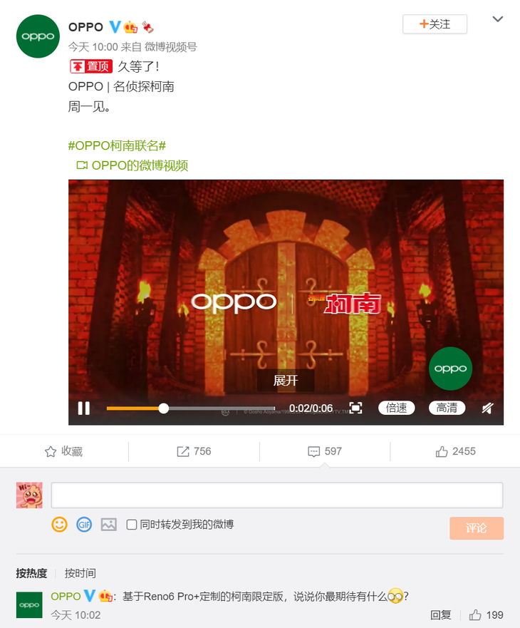官宣:OPPO将推出Reno6 Pro+柯南限定版
