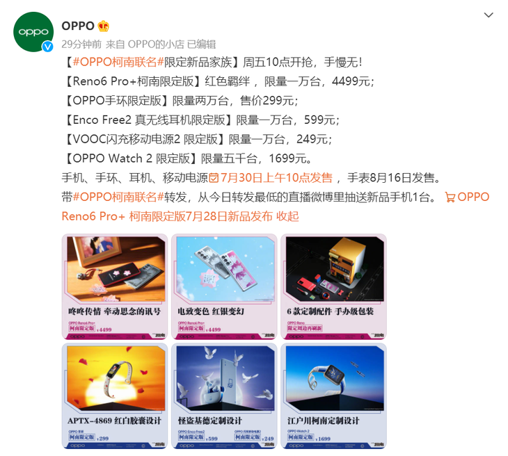 OPPO手环名侦探柯南限定版限量发售2万台,售价299元。OPPO Enco Free2真无线降噪耳机名侦探柯南限定版限量发售1万台,售价599元。OPPO VOOC闪充移动电源2名侦探柯南限定版限量发售1万台,售价249元。以上产品均将于7月30日起在OPPO官方商城-欢太商城、京东、天猫等渠道限量发售。