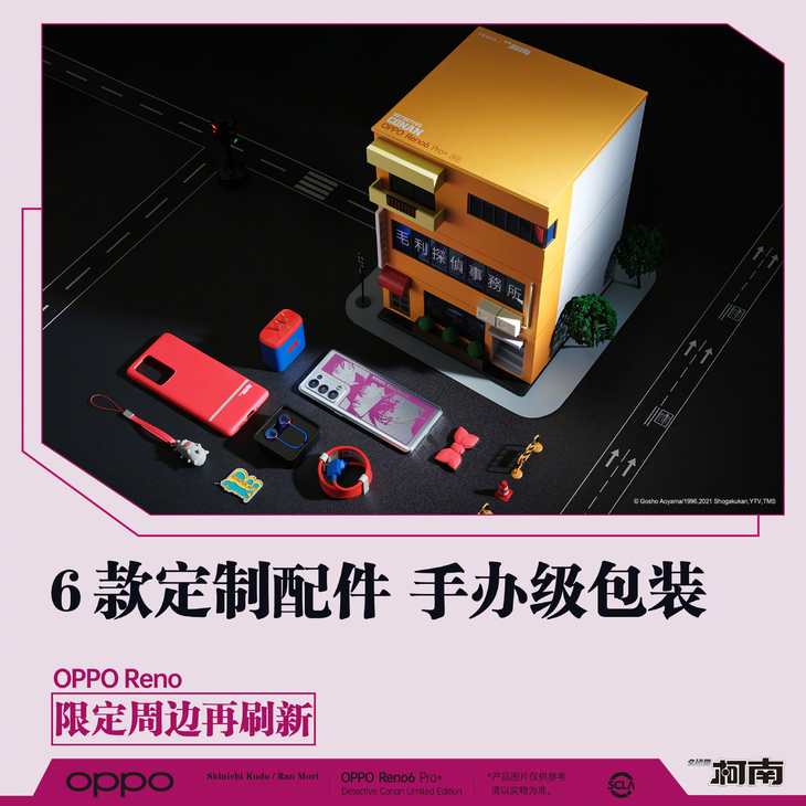 OPPO Reno6 Pro+名侦探柯南限定版的包装盒也基于柯南主题进行了重新设计,配备红色羁绊定制手机壳,致敬原作中毛利兰的红色手机。OPPO Reno6 Pro+名侦探柯南限定版还拥有海参男定制手机挂坠,红蓝定制充电头、数据线,新兰侧影定制耳机,少年侦探团定制卡针,柯南蝴蝶结定制绕线器定制配件,每一样配件都融入了柯南剧情中的经典元素,能够带来柯南名场面回忆杀。