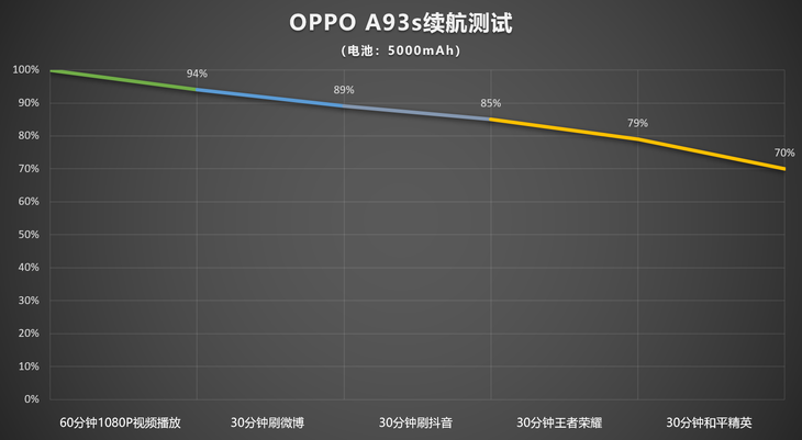 在续航方面,手机电量为100%的时候开始续航测试,屏幕为90Hz高刷模式,亮度为50%,测试环节包括在线观看一个小时1080P视频、刷微博抖音,玩游戏。在连续三个小时续航测试后,剩余电量还有70%。OPPO A93s在续航方面的表现优势明显,相信即使是稍重度的工作日使用,也不用太担心电量的问题。