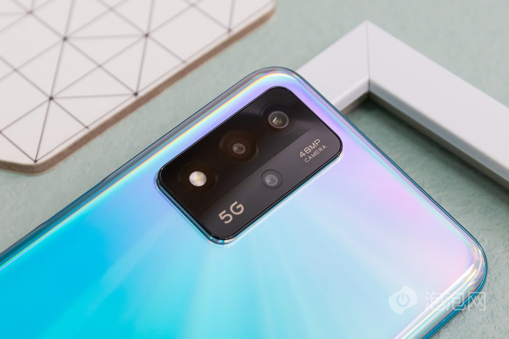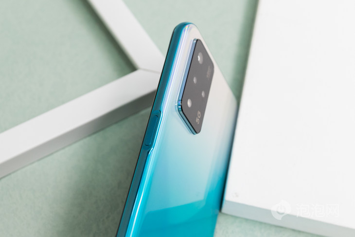 评测机为初夏光海配色,这个版本为光滑的亮面设计,与其它两个版本不同。手机背面从上到下颜色渐渐变深,主色调为淡蓝色。在不同角度下,手机会以摄像头模组为中心向外散发出变幻的光影线条,整体视觉效果变得更加灵动活泼。而白桃汽水和夏夜星河两种配色采用了磨砂工艺,质感一流,且不粘指纹。