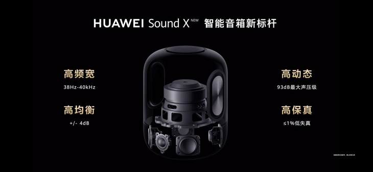 新一代HUAWEI Sound X内部共有4个5W的中音喇叭,1个50W重低音,1个3W高音喇叭以及1对无源辐射器。带来高频宽(38Hz-40kHz)、 高均衡(±4dB)、高动态(93dB)、高保真(失真<1%)的震撼声效。