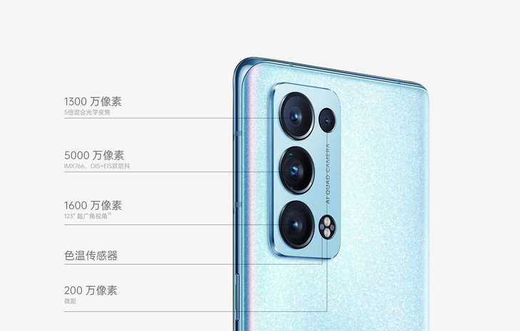 OPPO Reno6 Pro+在影像方面有着独特优势,后置为5000万像素主摄(IMX766,支持OIS光学防抖)+1600万像素超广角+1300万像素长焦(5倍混合光变)+200万像素微距四摄组合,具有色温传感器,前置为3200万像素镜头。