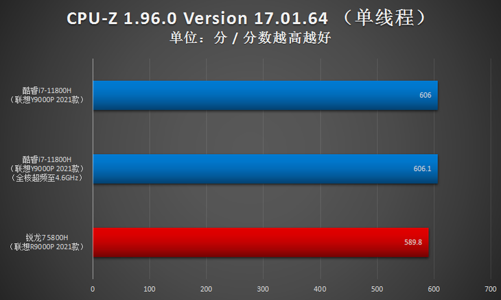在全核心超频至4.6GHz之后,酷睿i7-11800H的全核心性能获得了比较显著的提升。还有,由于酷睿i7-11800H默认状态下的最大睿频就是4.6GHz,因此将其全核心超频至4.6GHz之后,它的单核心性能并不会产生明显的变化。