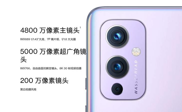 一加与哈苏携手打造一加9的影像系统,拥有哈苏自然色彩优化。一加9后置为4800 万像素主摄(索尼IMX689,1/1.43英寸)+5000 万像素超广角(IMX766,1/1.56英寸,自由曲面抗畸变镜头)+200 万像素黑白风格镜头三摄组合,支持混合对焦。