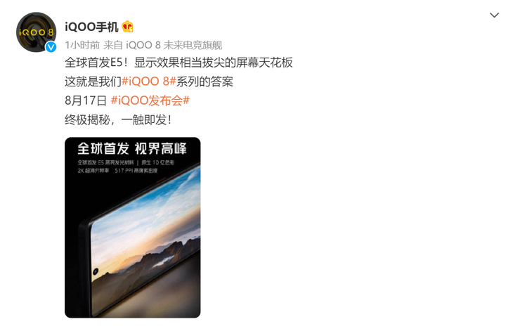 iQOO 8系列屏幕信息公布:E5发光材料+2K分辨率