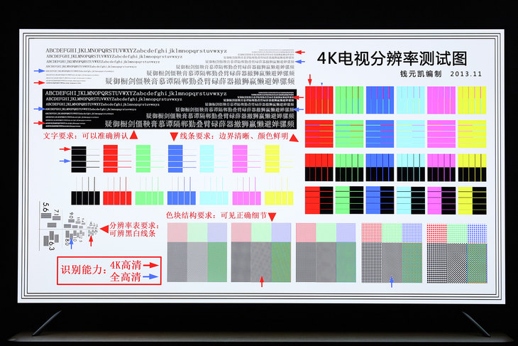从上面的电视分辨率测试截图可以看到,小米电视6 OLED的显示效果非常精细,可以清晰的分辨出细小的文字、横线等。尤其是黑底白字区域,如果是一台液晶电视,并且控光能力不是很强的话,很容易出现白色的文字外有一圈光晕,字体越小就越明显。而小米电视6 OLED凭借面板自发光的优势,即便是最小的文字也能清晰辨认。