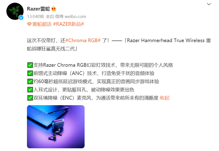 据Razer雷蛇官微公布的信息,雷蛇战锤狂鲨真无线二代蓝牙耳机发布,售价为999元。