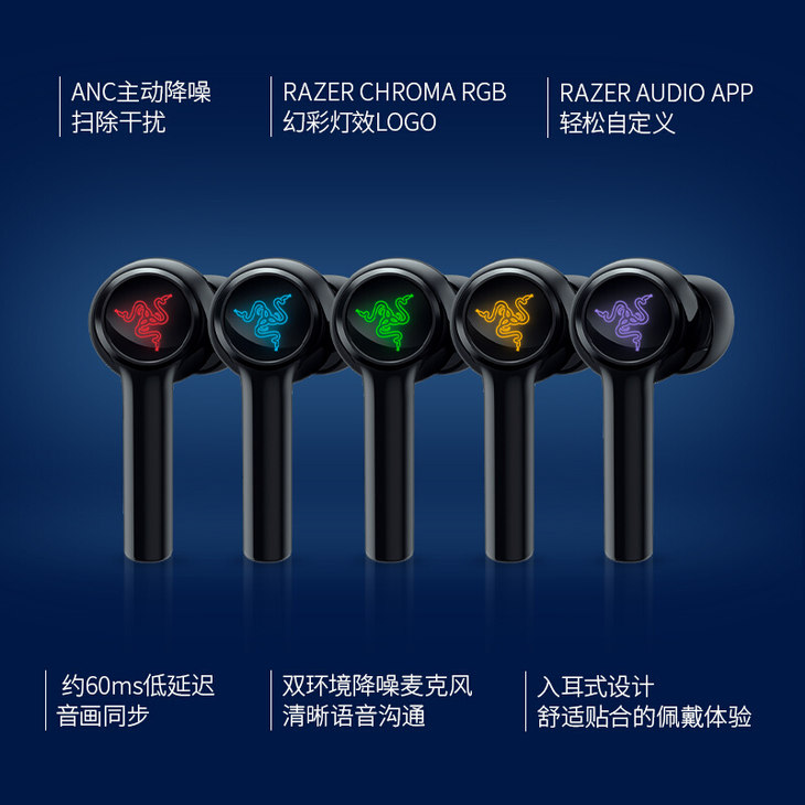 雷蛇战锤狂鲨真无线二代蓝牙耳机支持Razer Chroma RGB幻彩灯效技术,采用入耳式设计,支持前馈式主动降噪(ANC)技术。耳机支持60毫秒超低延迟游戏模式,实现真正的音画同步游戏体验,还配备了双环境降噪(ENC)麦克风,通话更清晰。