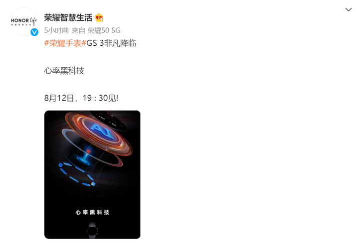 8月12日,官方表示,荣耀手表GS 3新品将在今晚19 : 30发布。