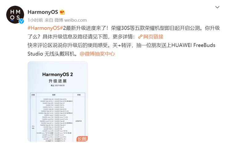 8月20日,HarmonyOS官方微博公布了华为HarmonyOS 2最新升级进度。