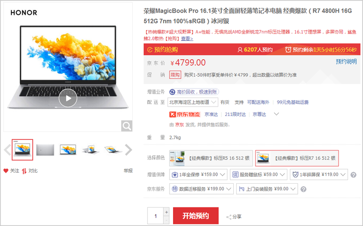 荣耀MagicBook Pro这款轻薄笔记本目前在京东商城的价格为4799元。平心而论,这款机型是5000块钱以内少有的大屏轻薄笔记本,锐龙7处理器很强,屏幕也很不错,学生一族购买性价比相当赞。