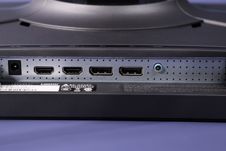 这款电竞显示器背面设计了电源接口、两个HDMI 2.0接口、两个DP 1.4接口、一个音频输出接口(用于连接耳机或者音箱)。
