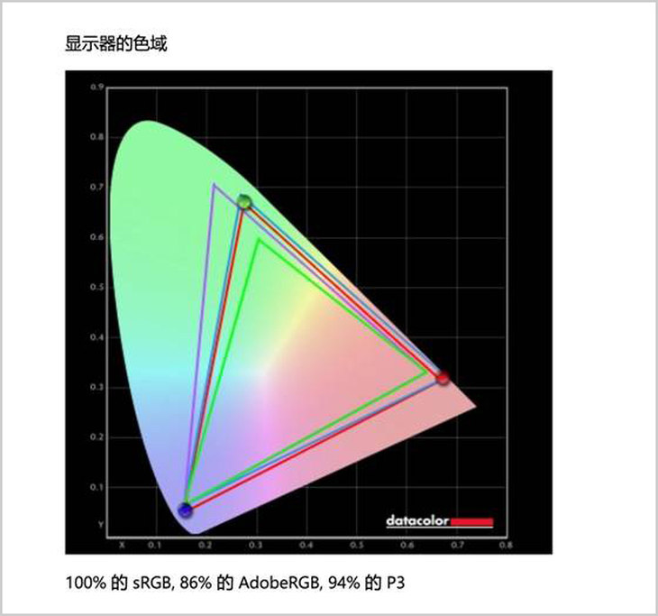 测试小结:这款显示器具备了100%的sRGB、86%的AdobeRGB、94%的P3色域覆盖率,表现非常不错。