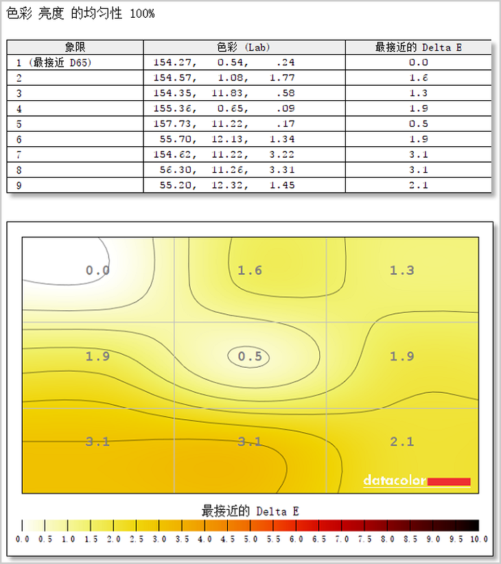 测试小结:在D65标准中,色温值为6500K表示色彩比较准确,不会出现偏冷或者偏暖。通过测试可知,sRGB色彩模式下,这款显示器左上角区域(1号测试区域)最接近D65的标准。屏幕下方和左下角区域(7、8号测试区域)偏差最大,差值为3.1。3.1的色温差值,表现尚可。