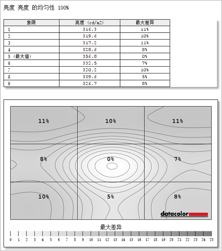 在亮度均匀性方面,在sRGB模式下测试,这款显示器中心区域(5号测试区域)亮度最高,达到了356.8cd/m2。100%亮度下最大差值为11%,亮度均匀性控制的也尚可。