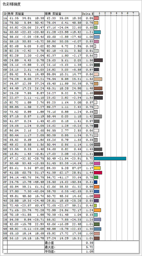 测试小结:平均△E为1.09,△E≥3的颜色只有一种。色彩精准度的表现比较好。