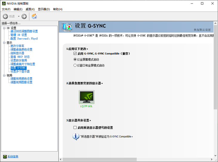 首先在显示器的主控制菜单中开启AdaptiveSync,然后在NVIDIA控制面板中开启G-Sync,此时系统的G-Sync模式便设置成功了。