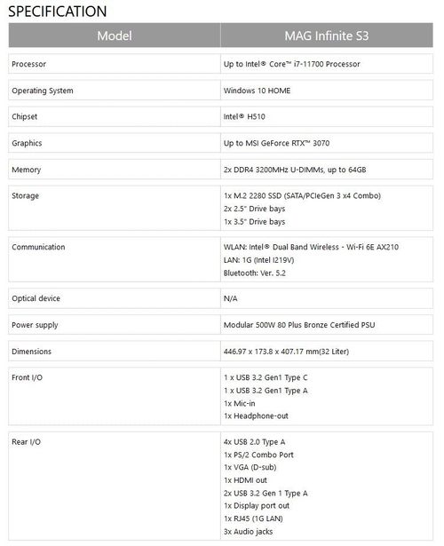 微星于近期推出了一款MAG Infinite S3游戏主机,它搭配有英特尔酷睿i7-11700处理器、H510芯片组主板、RTX3070显卡、DDR4-3200内存、500W 80PLUS铜牌认证电源等等。