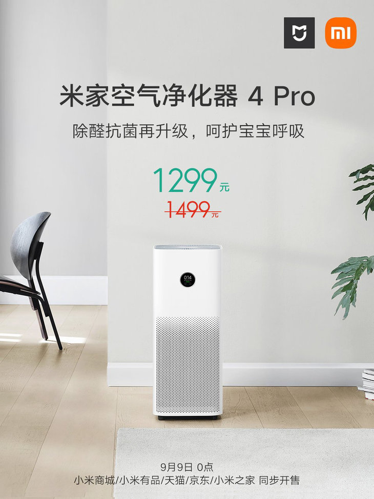 9 月 8 日消息 ,小米曾在本月初发布了米家空气净化器 4 Pro,在相关功能上升级了除醛抗菌能力。目前根据官方信息显示,米家空气净化器 4 Pro 将在明日 0 点正式开售,首发价格为 1299 元。