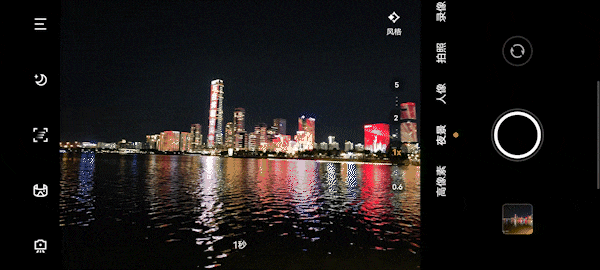 在夜景模式拍摄界面,可以直接拖动亮度条调整画面亮度,调节后的效果会实时显示在取景框中,你所看到的与最终成像效果十分接近,也就是我们常说的所见即所得,取景框还会显示拍摄这张夜景照片所需时间。