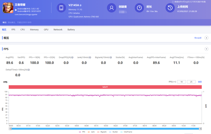 在25度左右的室温,《王者荣耀》游戏画质设置全开,支持90帧模式。软件记录的平均帧数为89.6帧,在11分钟的游戏中全程都能保证出色的流畅度。