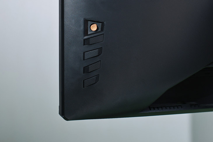 这款电竞游戏显示器的控制按键集中在了机身背面左侧。用户坐在显示器前面伸出右手便可轻松地对这组按键进行操控。