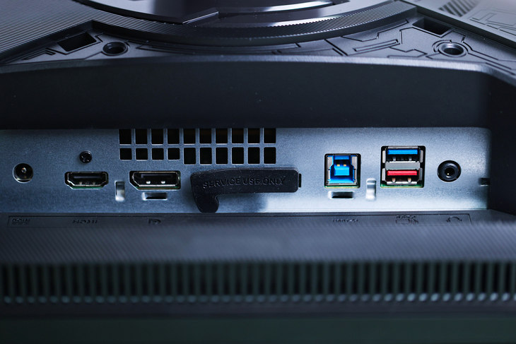 这款电竞游戏显示器背面设计了电源接口、一个HDMI 2.0接口、一个DP 1.4接口、一个USB上行接口、两个USB 3.0接口、一个音频输出接口(用于连接耳机或者音箱)。
