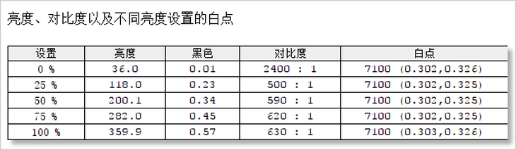 测试小结:这款显示器的色温值非常稳定,始终保持在了7100K,色温属于偏冷的。对比度方面,50~100%亮度区间内对比度比较稳定,0~50%亮度区间内对比度波动很大。