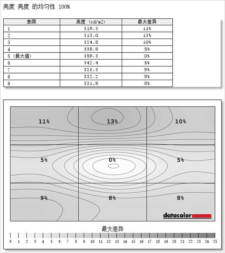 在亮度均匀性方面,这款显示器中心区域(5号测试区域)亮度最高,达到了359.3cd/m2。100%亮度下最大差值为13%,亮度均匀性控制得也尚可。