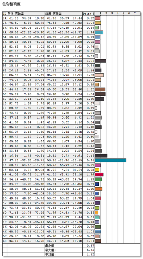 测试小结:平均△E为1.12,△E≥3且△E≥5的颜色只有一种。色彩精准度的表现比较好。