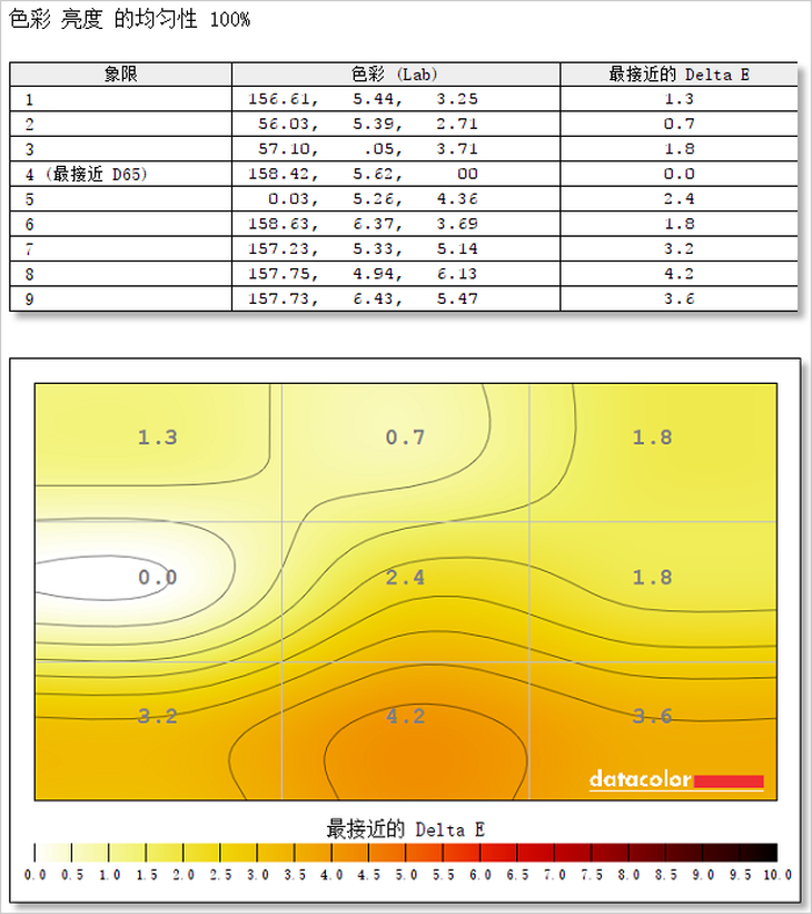 测试小结:在D65标准中,色温值为6500K表示色彩比较准确,不会出现偏冷或者偏暖。通过测试可知,这款显示器左侧区域(4号测试区域)最接近D65的标准。屏幕下方区域(8号测试区域)偏差最大,差值为4.2。4.2的色温差值,表现尚可。