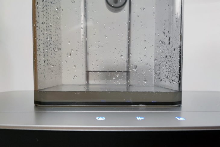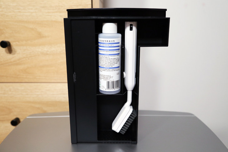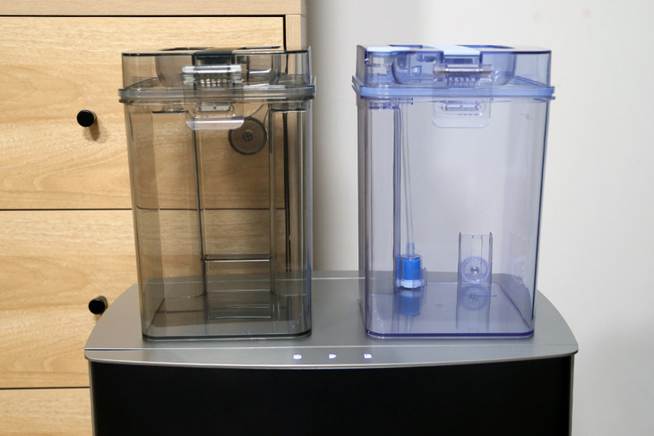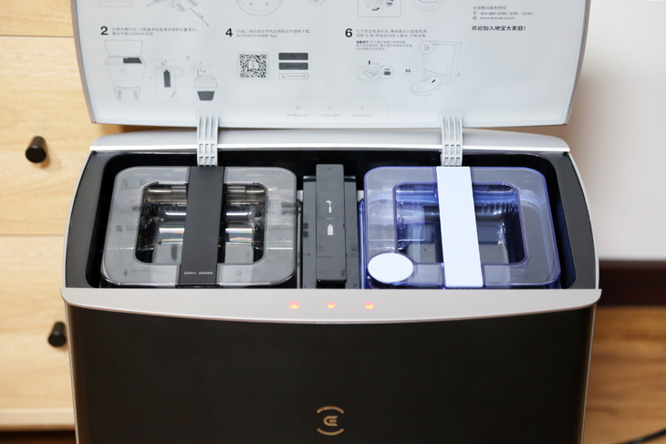 打开底座的顶盖可以看到两个水箱,分别是清水箱和污水箱,在清洗拖布的时候使用清水搓洗拖布,再将污水回收到污水桶中。用户还可以搭配地板砖用清洁剂,可以更好的去除地板和拖布的污渍,并且增加芳香,只需要将清洗剂导入清水箱即可。