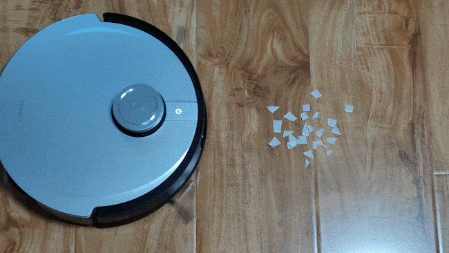 首先测试纸屑的清洁情况,将手纸剪成小块,放到地面上,手纸屑很轻,容易被风吹散。不过当地宝X1 OMNI经过之后,能够将所有的纸屑全部清理干净。