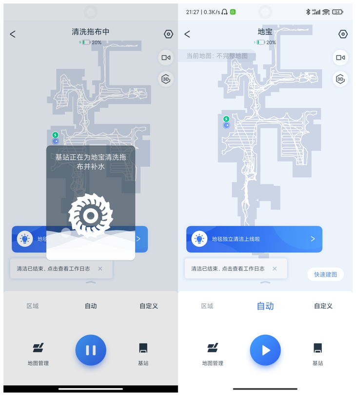 在全屋清扫的过程中,地宝X1 OMNI也会在清理一段时间后自动返回基站清洗拖布,这样可以保证拖地时拖布的清洁。