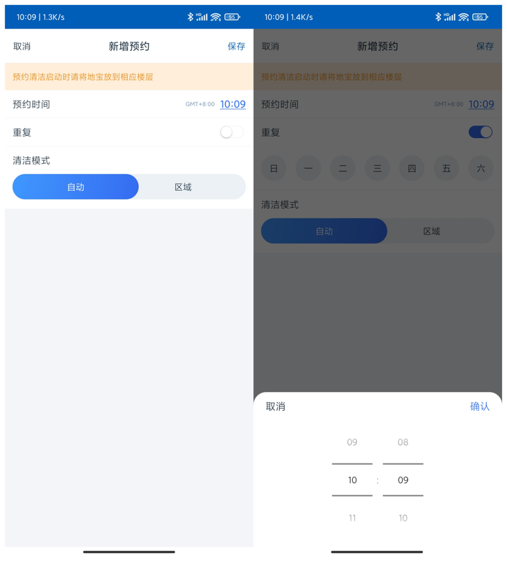 用户在手机APP上也可以进行一系列的预约操作,例如预约工作日、周末不同的时间进行定时清扫,让用户无需再自己动手清扫流程。