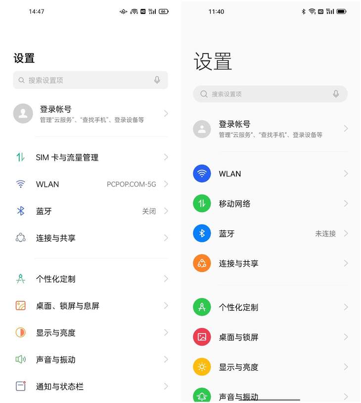 ColorOS 12的设置页面也体现了降噪的设计理念。相比ColorOS 11,不同设置选项之间留白空间更大,并且进一步淡化了分隔线,减少干扰项,视觉效果更舒适。ColorOS 12设置页面的图标也从原来简约清新风格变成鲜明的大面积彩色图标,视觉效果更突出。