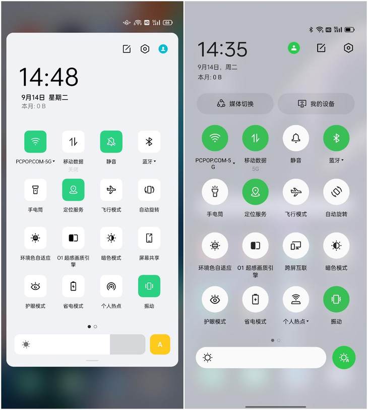 ColorOS 12对下拉控制中心也进行了升级优化,图标从ColorOS 11的方形变成了圆形。还有系统中不少方形元素都变成了圆形,这也是整体风格的转变。
