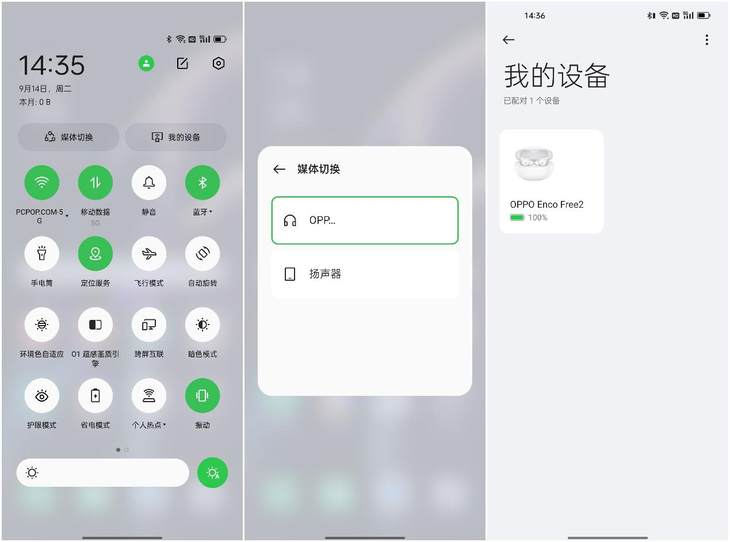 ColorOS 12在下拉控制中心增加了“媒体切换”和“我的设备”选项,提升多设备交互的便利性。“媒体切换”功能可以把媒体切换到不同设备,比如快速在无线耳机和本机之间切换。点进“我的设备”就能看到已经配对的设备,包括无线耳机、智能手表等,能够快捷查看和管理智能设备,要比ColorOS 11更方便。