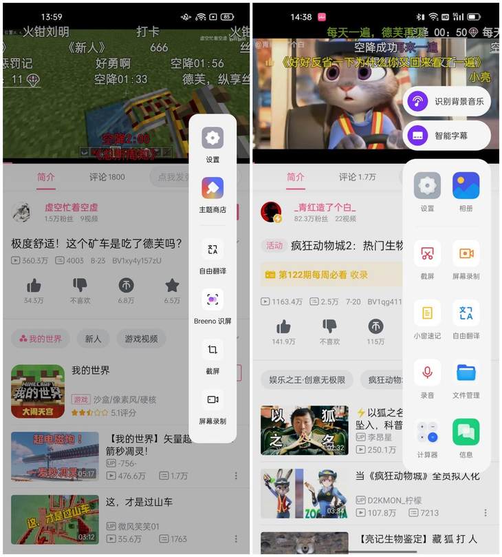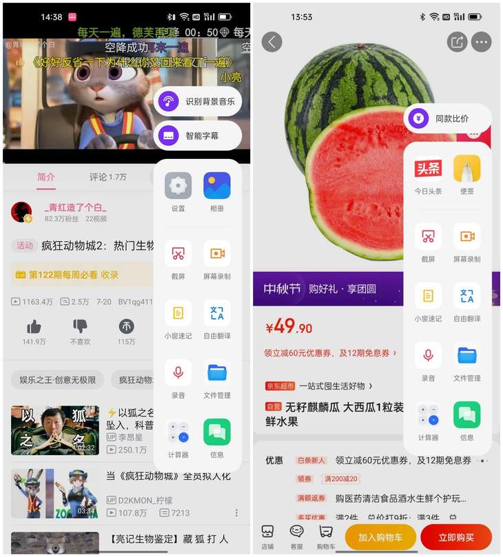 智能侧边栏2.0共加入了朗读文章、智能字幕、小窗速记、听剧模式、识别背景音乐、同款比价6款实用工具,会根据不同场景智能推荐。比如在哔哩哔哩看视频,智能侧边栏2.0会提供识别背景音乐、智能字幕功能,点击浮窗显示的小功能就能快速实现对应功能。在购物页面可以快速跳转同款比价,操作起来都很方便。