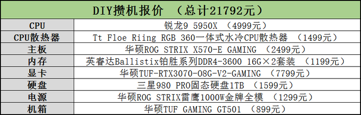 无论生产力还是游戏,锐龙9 5950X的性能都堪称是杠杠的。借着这个契机,笔者特别推荐一套基于锐龙9 5950X打造的高端攒机配置单,大家在攒机的时候可以作为参考。