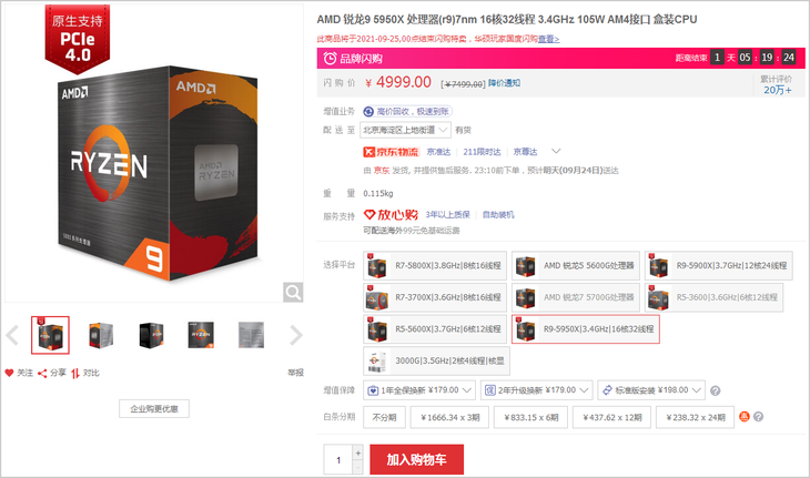 AMD锐龙5000系列台式机处理器近期降价幅度比较大。就拿旗舰级的锐龙9 5950X来说,在京东自营上面,这款上市价格6499元的处理器目前已跌破5000大关,降至了4999元。