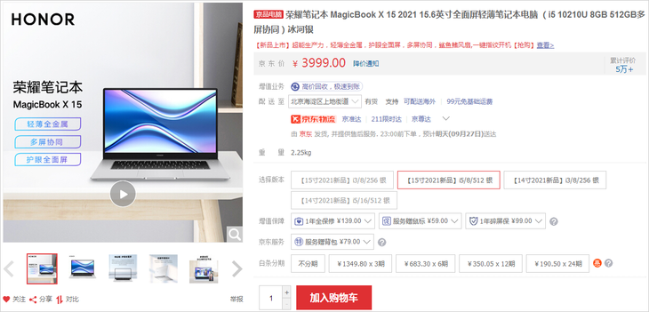 快国庆了,给大家推荐一款荣耀非常实惠的轻便型笔记本,它就是荣耀MagicBook X 15 2021。目前在京东自营上面,这款机器目前售价3999元。