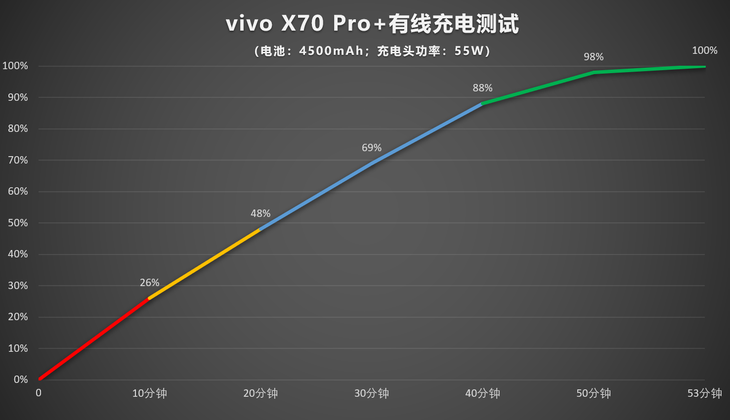 vivo X70 Pro+内置4500mAh电池,支持55W有线充电、50W无线充电以及10W无线反向充电,实测有线充电只需53分钟就能从0到100%的电量,无线需要64分钟。