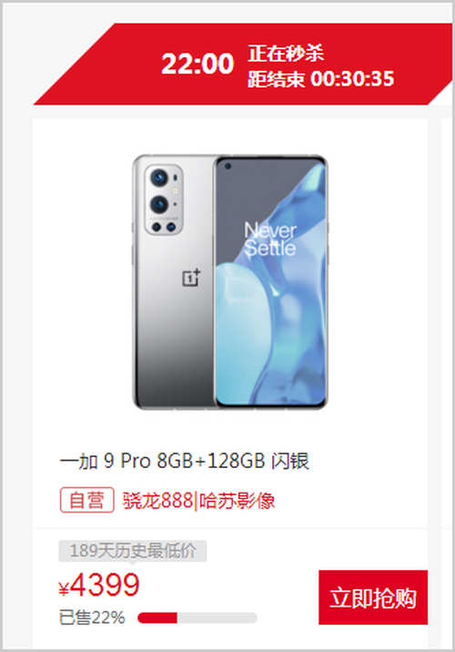 目前在一加手机京东自营官方旗舰店上面,一加OnePlus 9 Pro(8+128GB版本)降至了半年历史最低价,限时促销4399元,还可以叠加优惠券使用,挺超值的。对这款手机心仪已久的朋友们值得考虑。